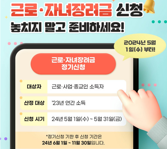 국세청이 소득이 적은 가구를 장려하기 위해 현금을 주어 근로 의욕을 높이는 제도로 2024년은 최대 330만원까지 지원받을 수 있는 정부 지원금입니다.