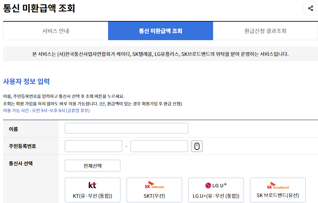 각 통신사 홈페이지에서 제공하는 미환급액 조회 서비스를 이용할 수 있습니다.